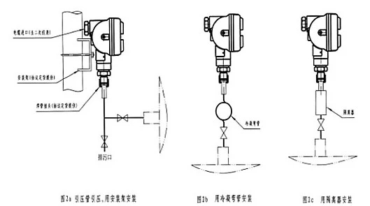 2、測量氣體壓力時,取壓口應(yīng)開在流程管道頂端,并且變送器也應(yīng)安裝在流程管道上部,以便積累的液體容易注入流程管道中。
