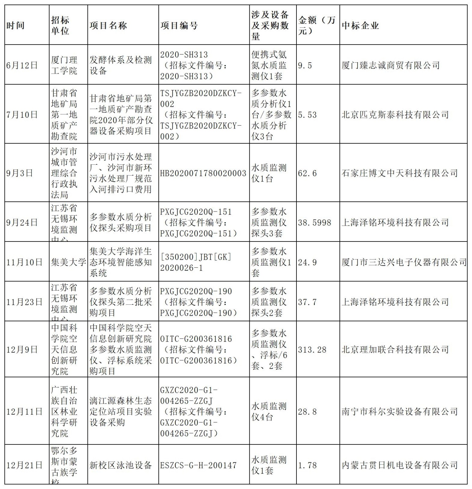 受疫情影響,2020年上半年水質監測設備相關招標幾乎停擺,招標工作主要集中在疫情進入常態化防控狀態的下半年,且全年關于水質檢測儀的招標僅有9場,較往年有所減少。