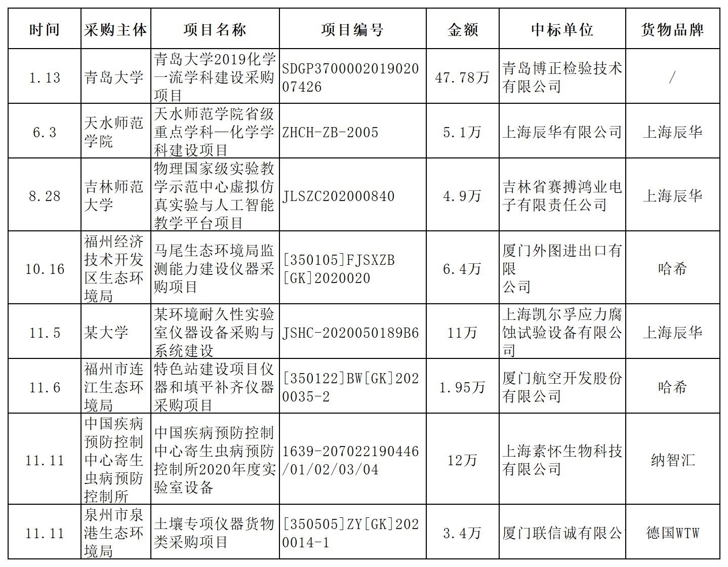 此外,從中標品牌來看,2020年電化學分析儀采購兼具國產和國外品牌,難分秋色。在9場中標采購中,上海辰華生產的電化學分析儀中標3場,行業巨頭哈希所產的電化學分析儀中標2場,是“出鏡率”最高的兩個貨物品牌。而從客單價來看,哈希2場中標貨物的總價為人民幣8.35萬元,采購總量為3臺,客單價為2.78萬元,上海辰華3場中標貨物的總價為人民幣21萬元,采購總量為3臺,客單價為7萬元,中標金額相對較高。
