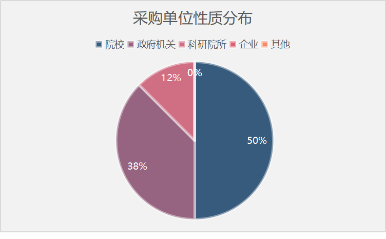 而從采購單位性質來看,院校和政府機關成為2020年電化學分析儀的采購主力軍,分別占比50%和38%,而科研院校占比較少,僅為12%。與往年不同的是,企業在2020全年的電化學分析儀采購中數量為0,較為少見。