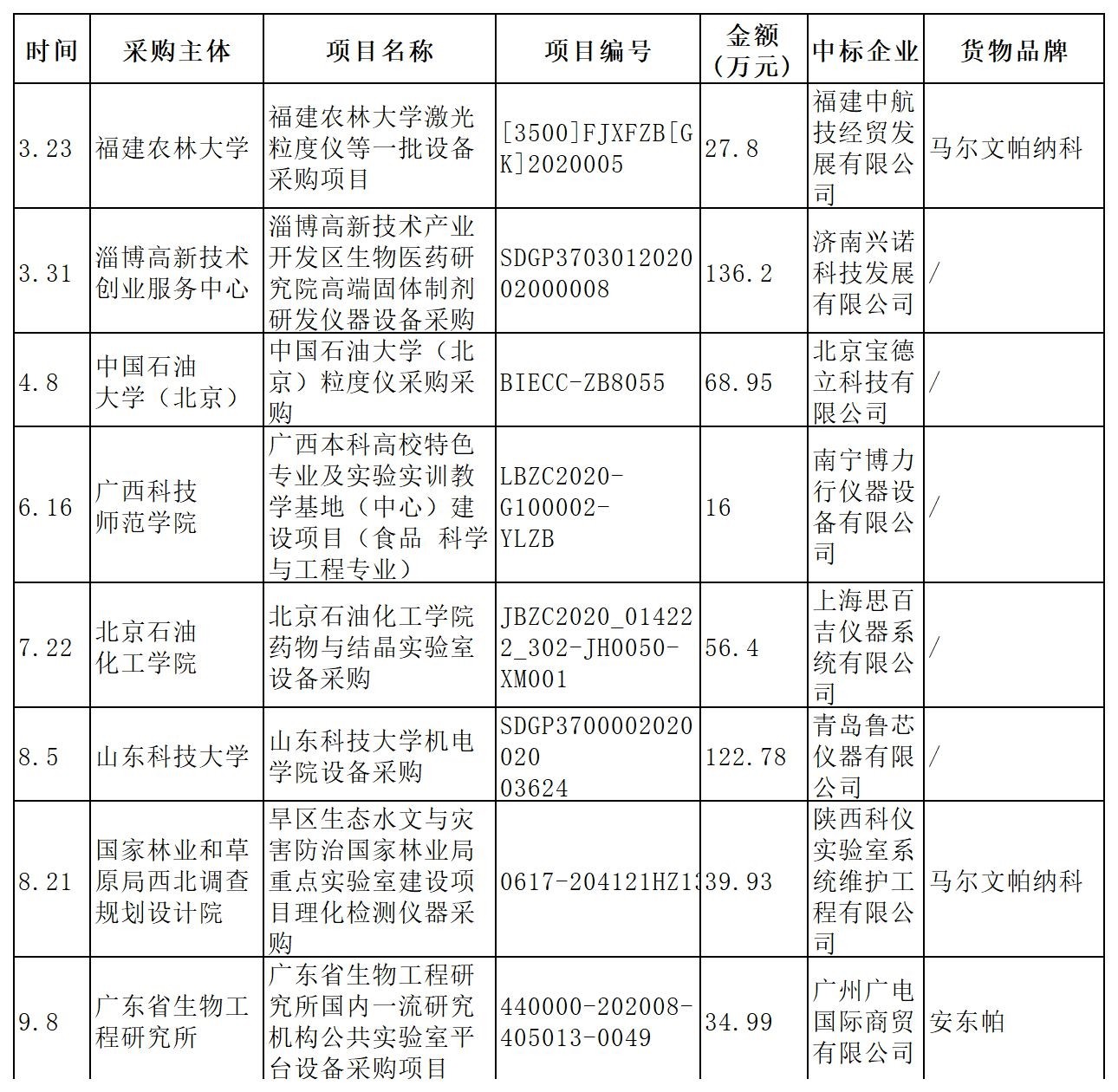 此外,從中標品牌來看,2020年電粒度儀采購兼具國產品牌和進口品牌。18場中標采購中,有10場公布了中標貨物品牌,其中可窺見進口品牌仍是市場寵兒,尤其是馬爾文帕納科、安東帕等老牌儀器廠商,“出境率”最高。而國內歐美克等知名廠商也占有一定的市場份額。