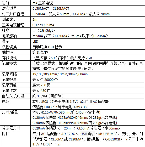 本儀器是1 A以下的微小直流電流(DC)測量用的數(shù)據(jù)記錄器。由專用鉗形傳感器(CL20MA /CL50MA)和顯示器(DL10MA)構(gòu)成。