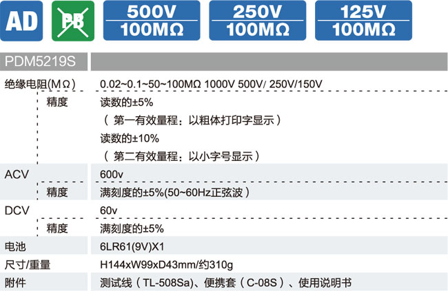 ■ 三個測試量程,測試電壓DC125V/250V/500V