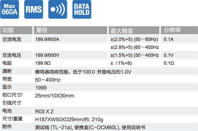 ■ 最大可測量交流電流600A, 最高分辨率0.1A
