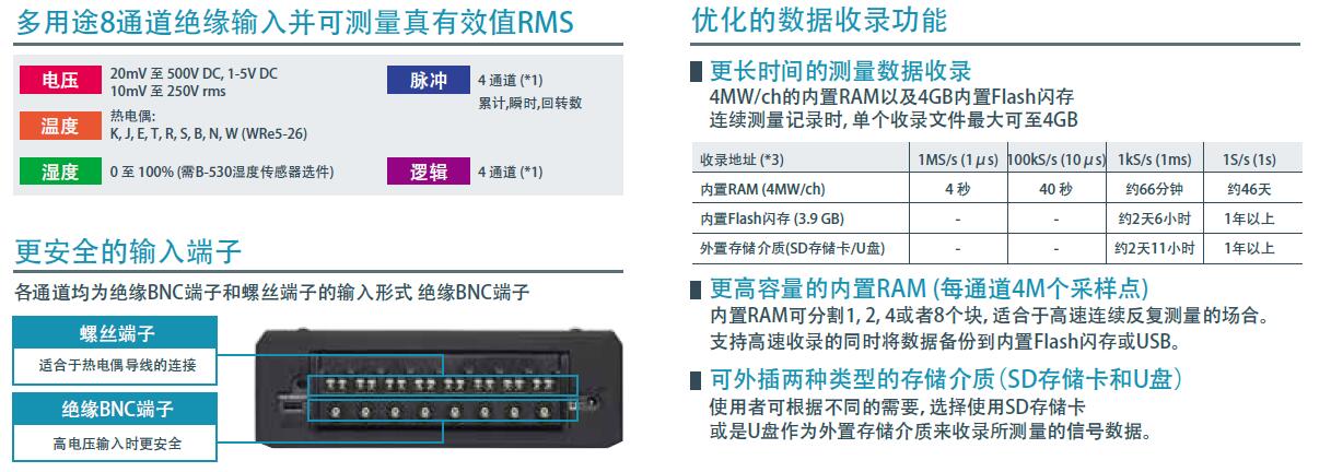 | 中繼收錄 | 當4GB的收錄文件滿時, 會生成新的收錄文件繼續記錄數據, 直到收錄停止 收錄地址: 內置Flash閃存, SD存儲卡, U盤 最快采樣間隔: 最快1ms (CSV格式收錄時10ms) | ||