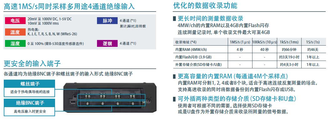汽車/鐵路/航空/宇宙等運行/飛行實驗、鋼鐵等生產中的探傷測定、醫療/制藥中的生體測定等波形記錄,電機電子、食品、農業、重電、物流業界。汽車行業(汽車、摩托車)測試 、家電(電器行業)廠家測試(含PC) 、油田測試(含海洋鉆井) 、各類野外測試、滅菌室、潔凈室的溫濕度測試 、冷藏運輸記錄 、跌落試驗 振動試驗撞擊試驗環境試驗等 。多功能輸入測量包括:電壓,溫度,濕度,脈沖,頻率,邏輯。