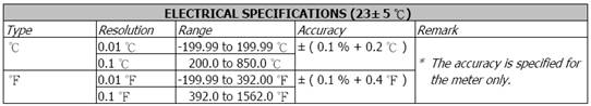 1.四位半顯示 最大顯示19999 2.功能: ℃ ℉ 0.01°/0.1° Data hold 3.分辨率: 0.01℃/0.1℃/0.01℉/0.1℉ 4.精度: ±(0.1%+0.2℃),< 200℃ ±(0.15%+0.5℃),≧200℃ 5.測試探棒:PT-100ohm,4線式量測(選購) 6.取樣時間:約0.4秒 7.尺寸: 180x72x32 mm 8.測量范圍:-199.99℃~800.0℃ 9.RS-232/USB連接接口(軟件選購) |