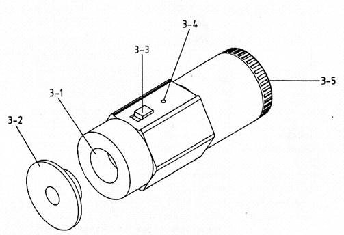 3-1 麥克風接合面(一英吋) 3-2 0.5英吋麥克風轉接頭 3-3 電源開關及電池測試開關 | 3-4 電池OK指示燈 3-5 電池室/蓋 |