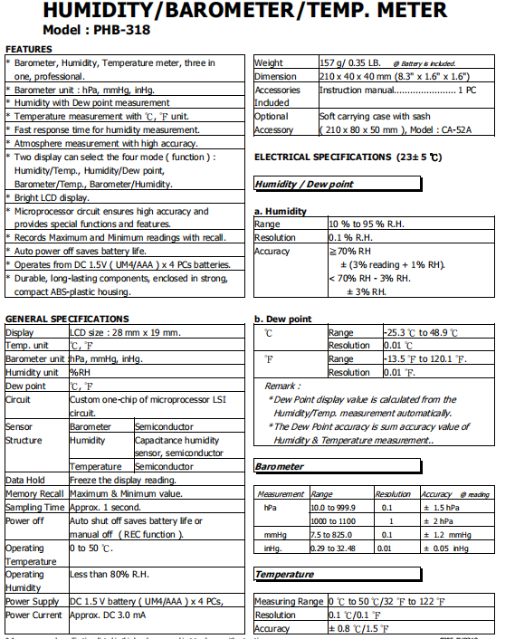 路昌LUTRON PHB-318 溫度|濕度|露點儀