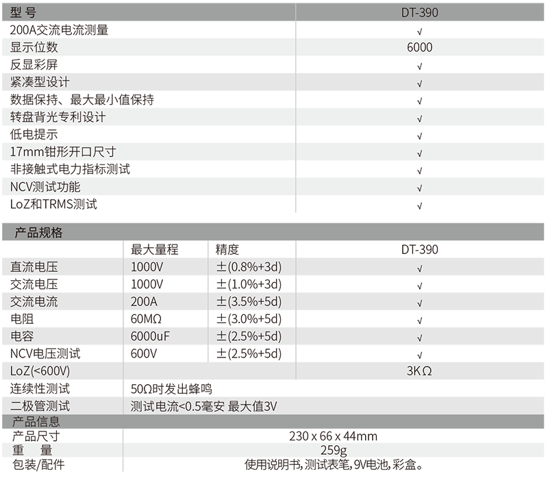 華昌盛 DT-390 非接觸式真有效值開口鉗形表