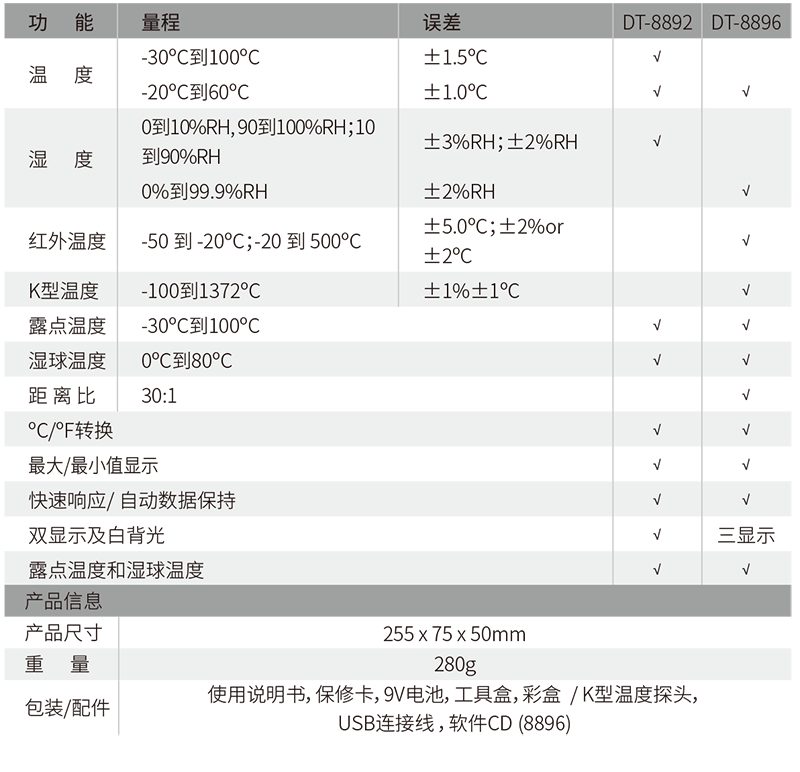 ● 三種專業測量方式:K型溫度探頭,紅外線和干濕球濕度計