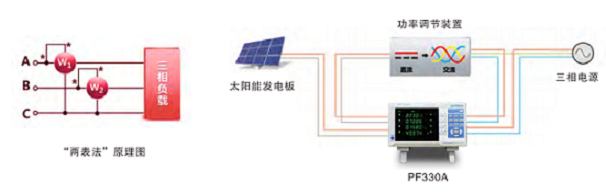 PF330A擁有三個(gè)測(cè)量通道,單臺(tái)儀器即可測(cè)量效率。其中兩通道采用“兩表法"測(cè)量逆變器的三相輸出信號(hào),另一通道測(cè)量逆變器的直流輸入。