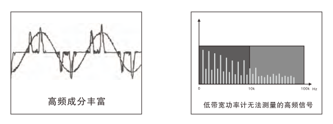 在測(cè)量正弦波時(shí),如測(cè)試開關(guān)電源、變頻家電等輸入波形中含有豐富高頻諧波成分時(shí),功率計(jì)的測(cè)量頻率范圍及帶寬不夠的情況下,無(wú)法測(cè)試其高頻諧波分量, PF330A系列能夠保證在測(cè)試這類產(chǎn)品時(shí),準(zhǔn)確測(cè)量功率及功率因素。