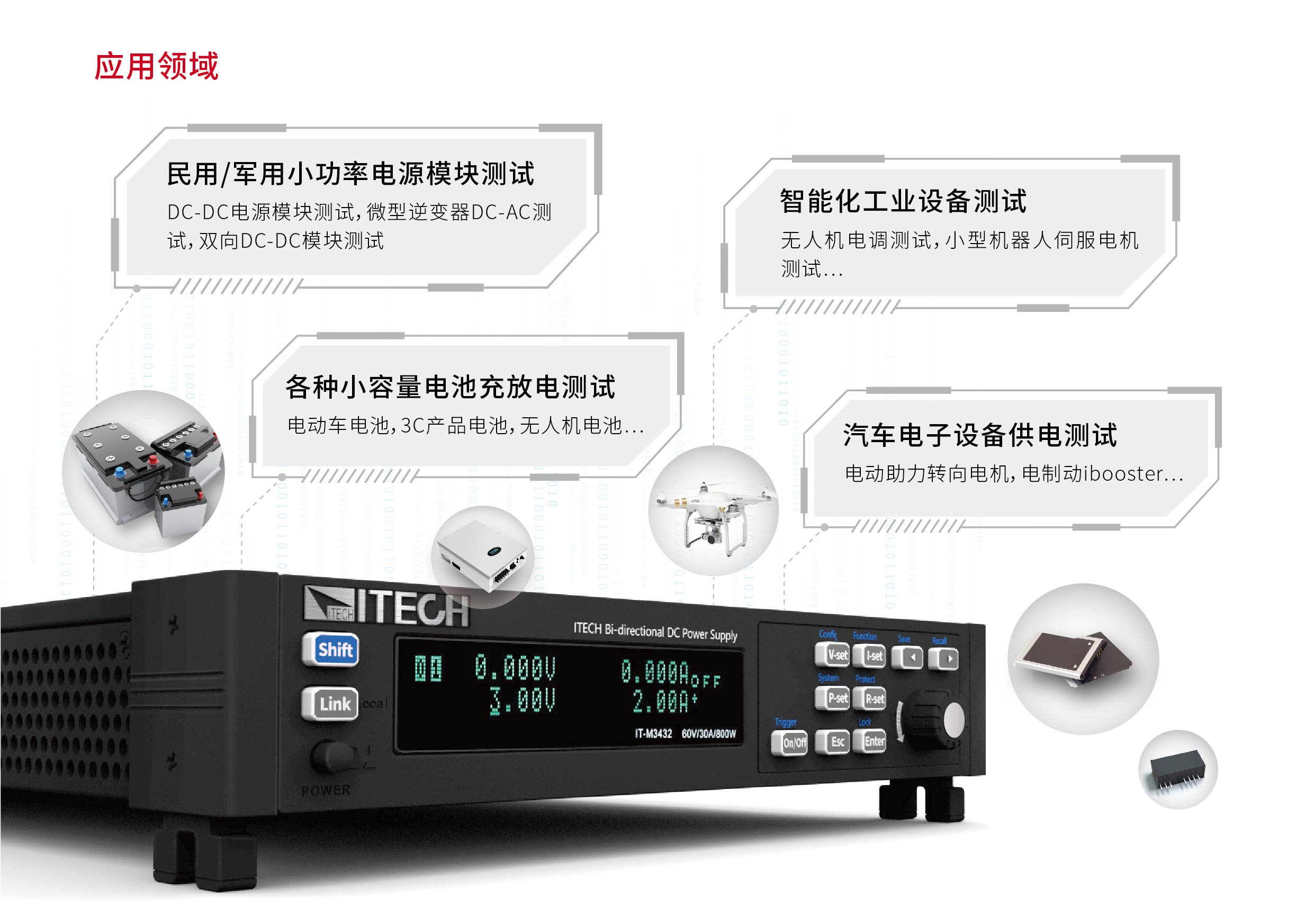 IT-M3400 雙向可編程直流電源集雙向電源和回饋式負載功能特性于一體,延續(xù)了M系列的高功率密度和模組式架構(gòu)設計,可以滿足客戶的不同電流功率的測試需求。獨立的多通道設計,用戶可依據(jù)待測物的測試需求數(shù)量與規(guī)格任意配置每一個通道,滿足客制化需求。同時具備高精度的輸出和量測,并且針對測試做了多項安全設計,適合用于電源模塊、智能化工業(yè)設備、汽車電子和各種小容量電池充放電測試等多個測試領域。