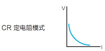 定電阻操作模式(CR):在定電阻模式下,電子負載被等效為一個恒定的電阻,電子負載會隨著輸入電壓的改變來線性改變電流。