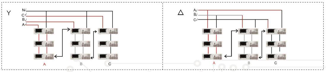 IT8600提供多臺并聯(lián)、三相與并聯(lián)三相的功能,可以實(shí)現(xiàn)對于三相交流電源或者更大功率電源的測試應(yīng)用。在三相并聯(lián)應(yīng)用中,用戶可以根據(jù)實(shí)際需求實(shí)現(xiàn)Y型和Δ型的連接方式,進(jìn)行自由靈活的搭配。IT8600還可以實(shí)現(xiàn)交流380V的輸入,全球通用,滿足多元的測試需求。