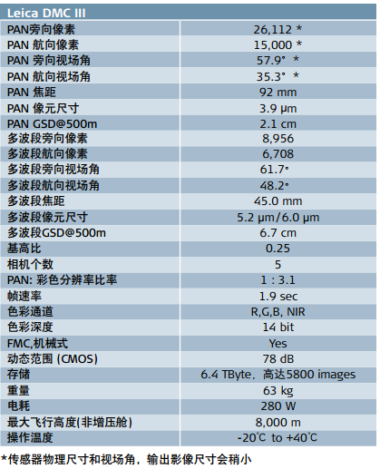| 最大單片傳感器-幅寬高達(dá)26,112*像素 基于針對(duì)航空應(yīng)用而專門打造的全新CMOS傳感器, Leica DMCIII航空相機(jī)提供世界上單片傳感器能夠覆蓋的最大幅寬:簡單而直接,旁向26112*像素。這比當(dāng)前市面上的其他相機(jī)至少提高25%。而且,得益于它革命性的像移補(bǔ)償設(shè)計(jì), Leica DMCIII將為您呈現(xiàn)單片傳感器前所未有的影像質(zhì)量和無可比擬的幾何精度。 隨著HxMAP的發(fā)布,徠卡測(cè)量系統(tǒng)為所有傳感器提供了最富創(chuàng)新性和直觀性的數(shù)據(jù)處理環(huán)境,大大提高了處理的速度和效率。 ![]() | 參數(shù)表![]() |