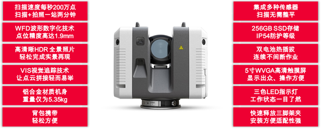 | 掃描速度每秒200萬點,掃描+拍照一站兩分鐘 超高速掃描速度,比傳統掃描儀效率提高數倍,掃描+拍照,一站兩分鐘,單站作業時間短,即掃即走,減少掃描等待時間 ![]() | |