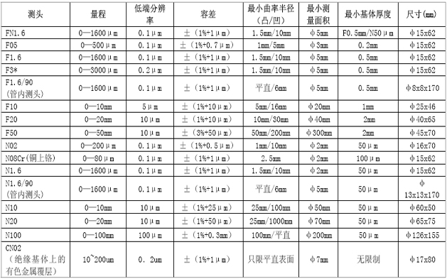 Mintest 1100-4100系列涂層測厚儀可選用測頭的技術數據