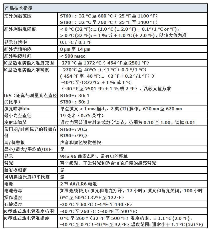 | ST80+ 和 ST60+ 的特性和優點:測量范圍: -32°C 至 760 °C /-25 °F 至 1400 °F (ST80+),或 -32°C 至 600 °C/-25°F 至 1100 °F (ST60+)借助軟鍵按鈕和點陣式顯示屏,輕松訪問高級功能可測量距離更遠、體積更小的對象,D:S比率達 50:1 (ST80+) 或 30:1 (ST60+)兼容所有標準迷你接頭 K 型熱電偶,保留在熱電偶上的投資可調輻射系數功能(內置材料表),讓用戶放心測量多種表面捕獲多個數據點(ST80+ 多達 99 個,ST60+ 多達 20 個)2 種級別的背光高度,輕松適應各種光照條件聲音和視覺警報,及時提示用戶測量值是否超出了設定的極限值通過最小值、最大值、平均值和 DIF 功能快速識別問題隨附的 K 型熱電偶珠式探針便于立即進行接觸式測量1 % 的測量準確度讓用戶放心檢修設備多功能界面有 6 種語言可供選擇 |
