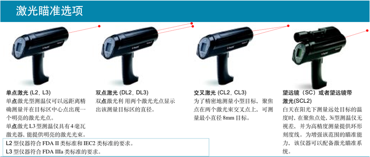 溫度可以達到1200°C。使用Raynger 3i產品,可有如下選擇:單激光瞄準、雙激光瞄準、
