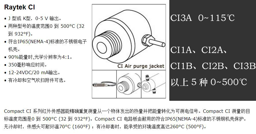 ● CI系列測溫儀專門為目標溫度范圍為0~500℃的應用而設計。CI電路板由耐用的符合IP65(NEMA-4)標準的不銹鋼電路盒所封閉;無冷卻時,傳感頭耐環(huán)溫達70℃;有冷卻套時,CI可耐環(huán)溫高達260℃。