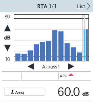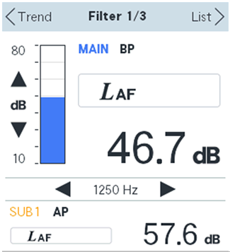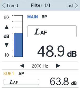 使用1/1倍頻程濾波功能確認噪聲時,在喧鬧的測量環境下,可以排除其他噪聲的干擾聽覺確認特定頻率的噪聲。 通過傳聲器的指向,可以進行聲源的探測。并且Allpass(全頻域)與 Bandpass(特定頻域)的聲壓級也可進行比較。