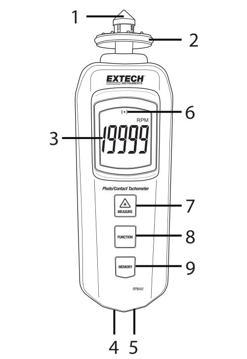 長按 MEASURE 按鈕 (7),然后在按住 MEASURE 的同時,短按 FUNCTION 按鈕 (8) 以逐一顯示這些模式。可用模式包括:接觸式轉速測量、表面速度 (m/min)、表面速度(ft/min)、表面速度 (in/min) 和光電轉速測量(激光筆將打開此模式)。