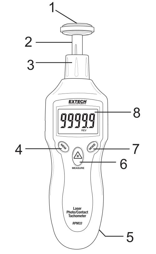MEASURE(測量)按鈕:長按以獲取讀數。按下時將開啟用于光電轉速測量的激光筆
