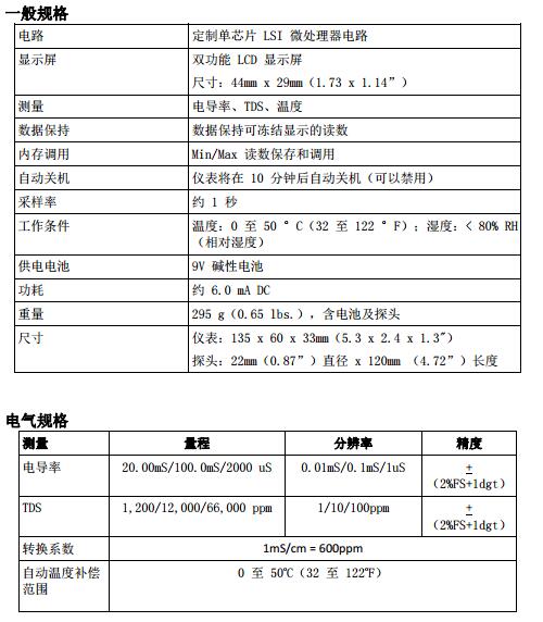 三個范圍的電導率和TDS加上可調節的溫度補償系數,以保持精度