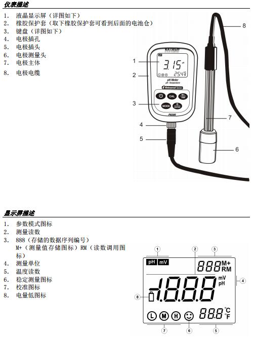 完成pH / mV /溫度電極,保護橡膠皮套,pH校準溶液,2節AA電池和硬質手提箱