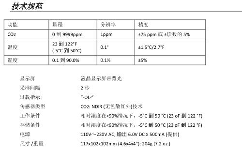 CO100這款二氧化碳監控儀可以測量二氧化碳濃度,用于控制空氣質量和健康情況。在液晶顯示屏上顯示二氧化碳測量值(ppm)、溫度、濕度、時間以及二氧化碳狀態:良好(0 到800ppm),正常(800‐1200ppm),不良(>1200ppm)。當二氧化碳濃度超過規定濃度時,會發出報警聲。該款儀表在出廠前經過了充分測試和校準,如精心使用,可保證多年的可靠服務。