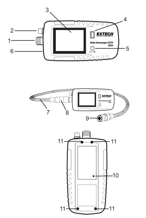 1. 電源開關: 按住電源按鈕, 顯示器將照亮內部電池充電。再次按住電源按鈕以關閉視頻內窺鏡。