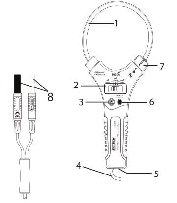 6. 用柔性鉗頭探頭將待測裝置的唯一一條導線完全鉗繞(見附圖)。切勿嘗試測量超過儀表額定電流范圍的任何電流。