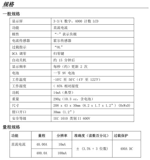 DC400是一個400安培直流迷你鉗形表。電流鉗在兩個范圍內測量高達400安培直流,單觸自動歸零,自動關機,數據保持和高精度。配有橡膠皮套,腕帶,皮帶皮套和9V電池。