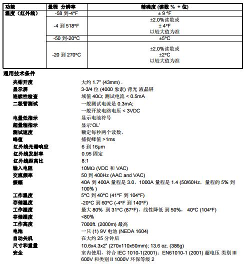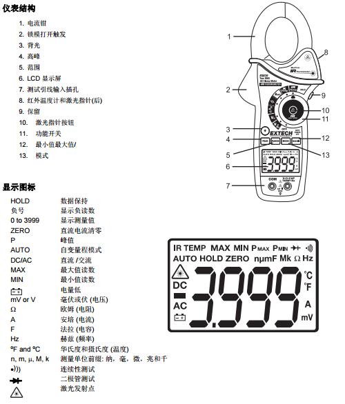 EX810 鉗表此計可測量交流/直流電壓、交流電流、電阻、電容、頻率、二級管測試、連續性、以及非接觸式紅外溫度。 正確的使用和照顧這個表將提供多年可靠的服務。