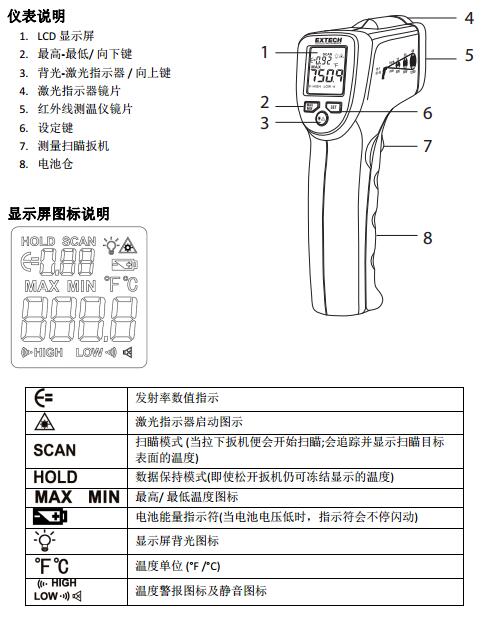 4. 儀表的程序默認(rèn)使用關(guān)機(jī)前的設(shè)定。例如:在關(guān)機(jī)前,激光指示器被設(shè)為開啟,而溫度單位設(shè)定為華氏﹔儀表于下一次開機(jī)后仍會(huì)使用同樣的設(shè)定