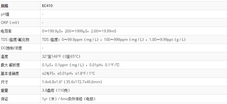 EC410套件包括EC400ExStik?電導(dǎo)率/ TDS /鹽度溫度計(jì),帶有傳感器,保護(hù)蓋,三個(gè)校準(zhǔn)標(biāo)準(zhǔn)(每個(gè)30mL瓶),加重底座,3個(gè)樣品塑料杯,帶蓋,四個(gè)3V CR-2032電池,48個(gè)(1.2米)頸帶和手提箱。自動(dòng)量程儀提供從自來(lái)水到廢水和任何水溶液三種測(cè)量范圍。自動(dòng)溫度補(bǔ)償為2%/°C。數(shù)據(jù)保持,自動(dòng)關(guān)機(jī)和低電量指示。內(nèi)部存儲(chǔ)器最多可存儲(chǔ)25個(gè)標(biāo)記的讀數(shù),便于調(diào)用。