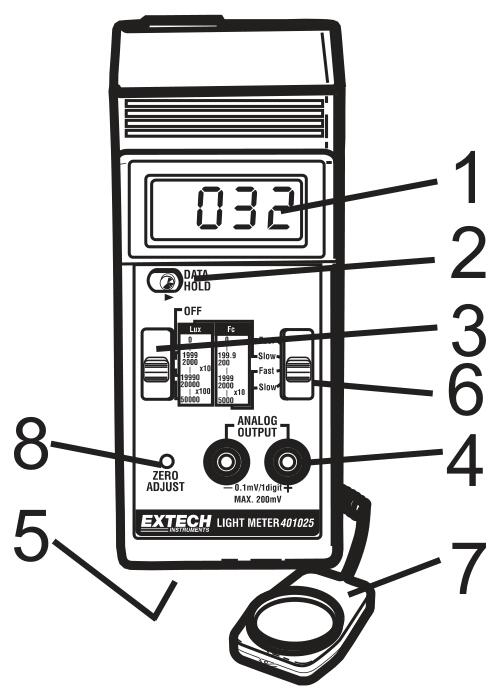 4.顯示器可顯示測量的值。如果在 Lux 使用范圍顯示乘數20,000 和 50000 范圍或在 Fc 5000 范圍。