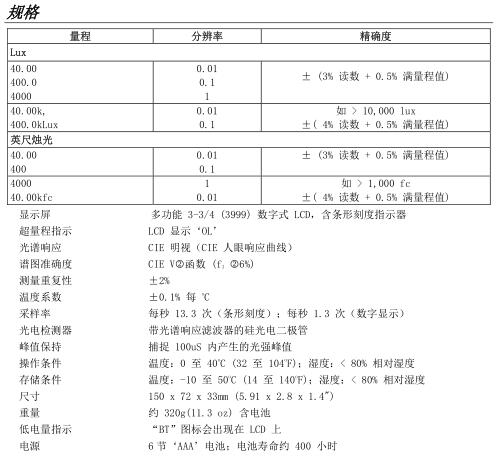 按下 HOLD 按鈕以凍結顯示的讀數。“H”保持圖標將出現在顯示屏的右上角。再次按下 HOLD 按鈕可返回正常操作模式(“H”保持圖標將消失)。啟用保持功能后,模擬條形刻度將繼續顯示光線強度的改變。