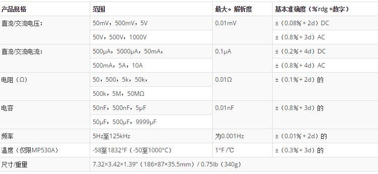 MP530A是一個5000計數,True RMS自動測距萬用表測量AC / DC電壓,AC / DC電流,電阻,溫度,電容和頻率,基本精度為0.08%。附加功能包括:二極管測試,連續性檢查,易于閱讀的背光顯示,自動關機,數據保持和低電阻自動導線零點。UL列出,CAT IV-600 Volt等級。包括帶有內置支架,測試導線,K型珠溫度探頭和9伏電池的保護套。
