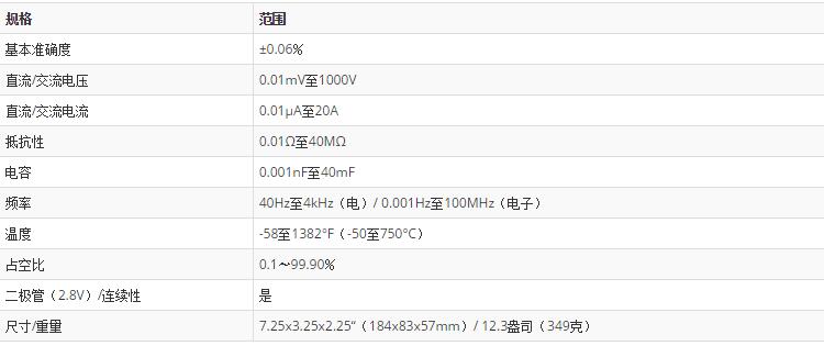 AC / DC電壓和電流,電阻,電容,頻率(電氣/電子),溫度,占空比,二極管/連續(xù)性