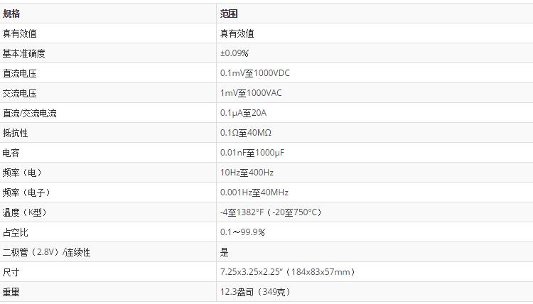 AC / DC電壓和電流,電阻,電容,頻率,溫度,占空比,二極管/連續性