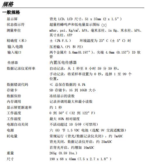 SDL710 型壓力計(jì)。該設(shè)備測量壓力表和±2.9 psi 范圍內(nèi)的壓差。支持的測量單位包括 mbar、psi、Kg/cm2、毫米汞柱、英寸汞柱、米水柱、英寸水柱、標(biāo)準(zhǔn)大氣壓力、hPA 及 kPA。記錄的數(shù)據(jù)讀數(shù)保存在 SD 卡中,以便傳輸?shù)?PC。該儀表在交付前均經(jīng)過完整測試及校準(zhǔn),若使用得當(dāng),可提供多年可靠的服務(wù)。