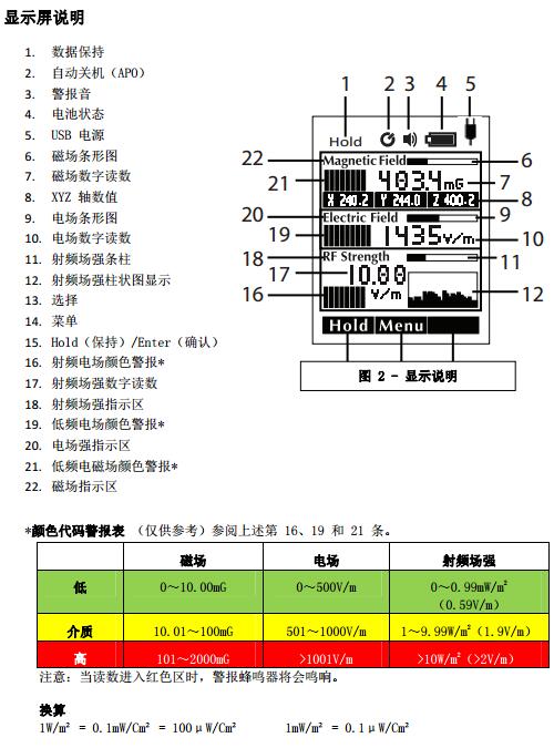 射頻場強單位選項:(μW/m2 ~mW/m2) (μW/cm2) (m V/m ~V/m) (mA/m)(dBm)。