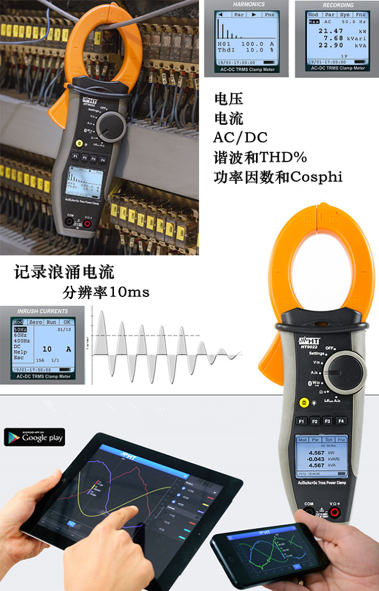 HT9022適用于解決電能質量問題,校正功率因素,記錄能力損耗,記錄直流功率等。不同于數據記錄儀,數據記錄儀記錄一個時間間隔的數據而沒有時間間隔之間的數據。HT9022是一個電能質量分析儀,可以連續記錄所有的電氣參數,內部存儲器可以進行長期記錄并進一步下載到PC,PDA或者智能手機上進行分析。給用戶提供了靈活方面的操作界面,并且最大程度上保證測量可靠。
