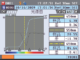 | 顯示內容 | 光譜數據,光譜圖,色度數據,色差數據,色差圖,合格/不合格判斷,仿真色彩,色彩評估 | |
