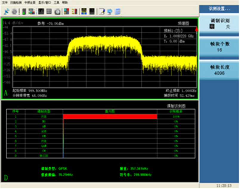 • 可識別的數字信號:2ASK、4ASK、MSK、2FSK、4FSK、8FSK、16FSK、16QAM、32QAM、64QAM、128QAM、256QAM、BPSK、QPSK、8PSK、16PSK、OQPSK、PI/4QPSK。