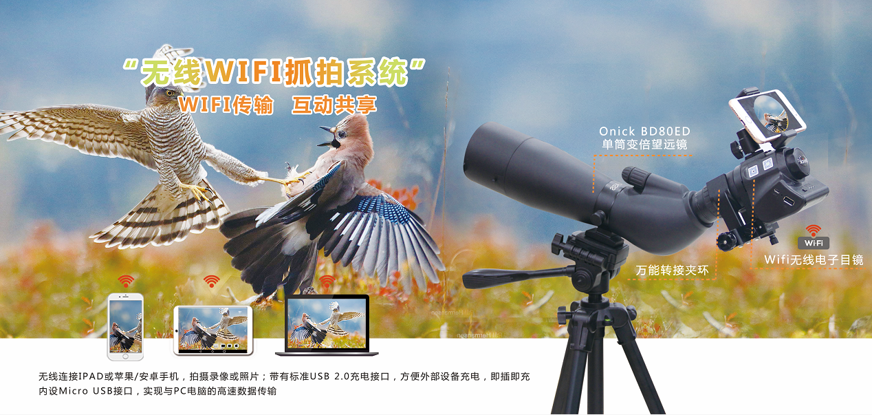 onick Eye-500電子目鏡具有安裝簡便,通用性強、功能齊全、簡單易用等特點。使現有的普通光學望遠鏡立刻升級為WiFi電子數碼望遠鏡,配合量身定制APP軟件,可同時任意連接手機、平板電腦、實時觀察、拍照、錄像,讓您的觀察等更為直觀生動,使大量、繁瑣的工作變得有趣、輕松、高效。