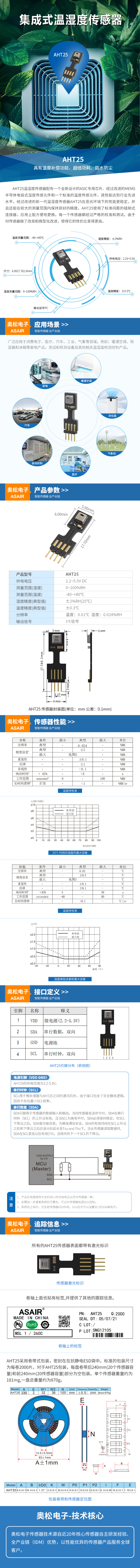 AHT25溫濕度傳感器配有一個全新設計的ASIC專用芯片、經過改進的MEMS半導體電容式濕度傳感元件和一個標準的溫度傳感元件,精度高、穩定性好、抗干擾能力強,即使在惡劣的環境也能發揮穩定性能;使用標準I2C接口,響應迅速,出廠時均經過溫度補償,功耗非常低,是眾多低功耗產品的理想選擇。